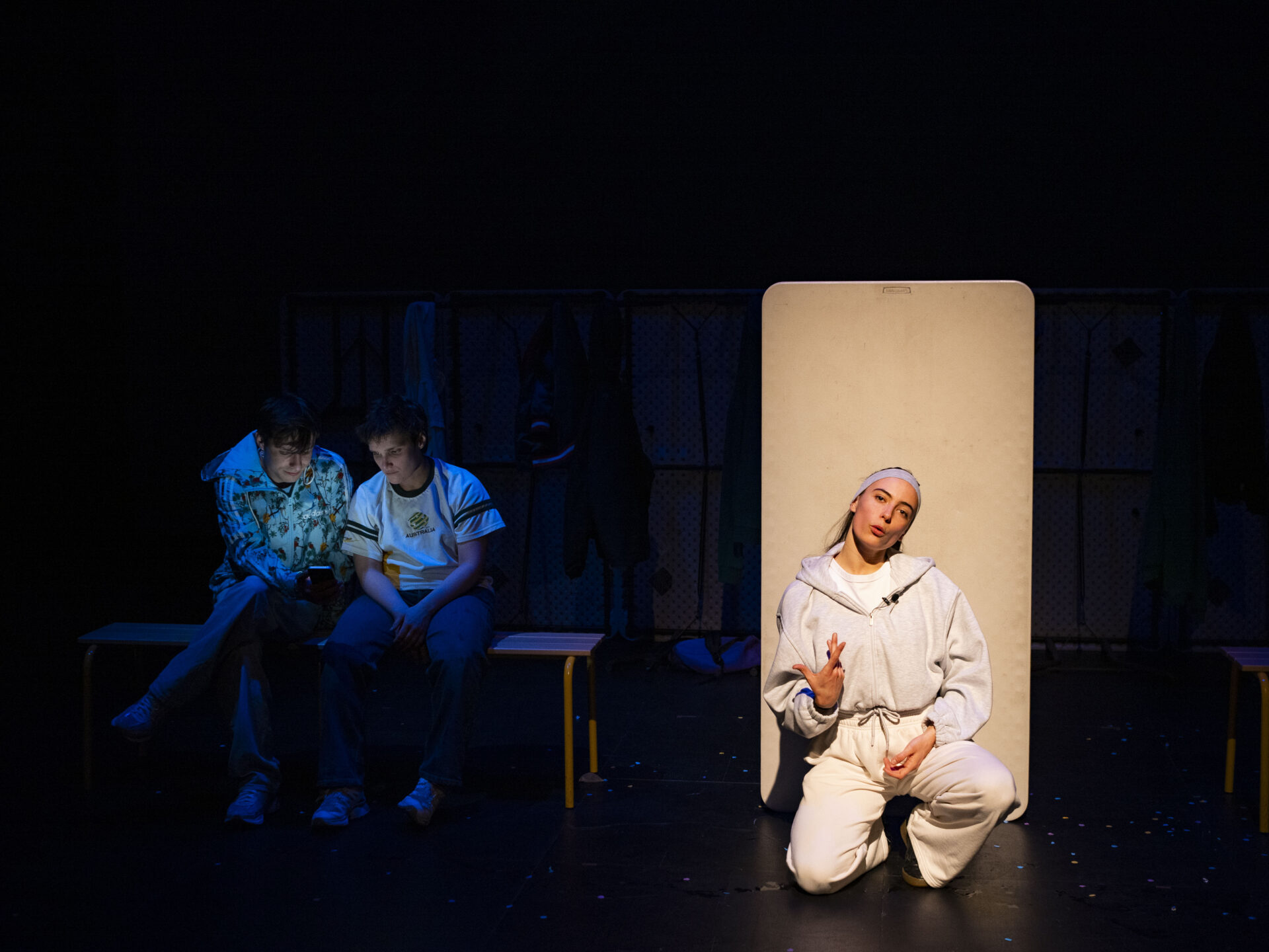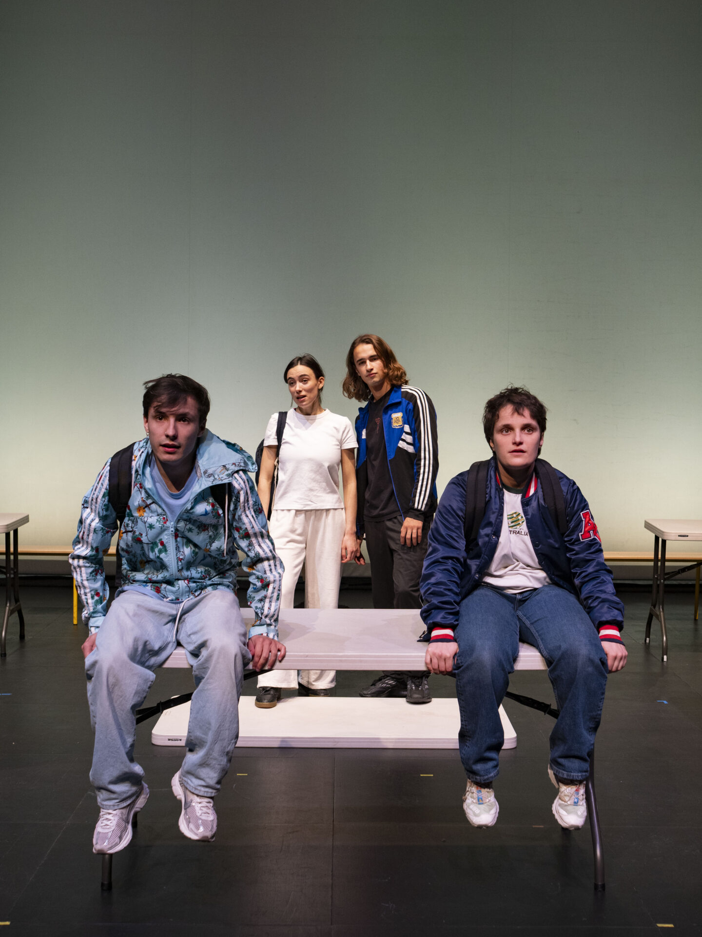 Teen play nous plonge dans l’enfer impitoyable du collège – pas de la fac américaine, non, du collège bien de chez nous … Ce qui est assez génial dans cette pièce, c’est que même un boomer comme moi s’y reconnait. Un monde de Bully, de geek, de “filles populaires”, de “bons en sport », de bolloss… Mais aussi d’amitiés naissantes, d’engouements extrêmes, de découvertes fascinantes qu’offre simplement le fait de grandir, un peu, chaque fois. La metteuse en scène s’empare à merveille d’une écriture qui glisse de l’universel à l’intime : avec les moyens du bord, quelques tables et quelques bancs et ses quatre très bons interprètes, elle joue de la grande liberté de ton et de forme de la pièce, avec ces monologues intérieurs, souvent très drôles, parfois poignants, qui surgissent en pleines scènes dialoguées, elle construit des glissements de rôles toujours très clairs qui permettent les passages du collectif indistinct à des personnages bien dessinés ; S’ajoutent de belles et nombreuses inventions d’ensemble – chants, textes choraux… – pour les changements scéniques. Bref, une maitrise qui sert et que servent admirablement les quatre jeunes gens du plateau… Laurent Hatat, metteur en scène